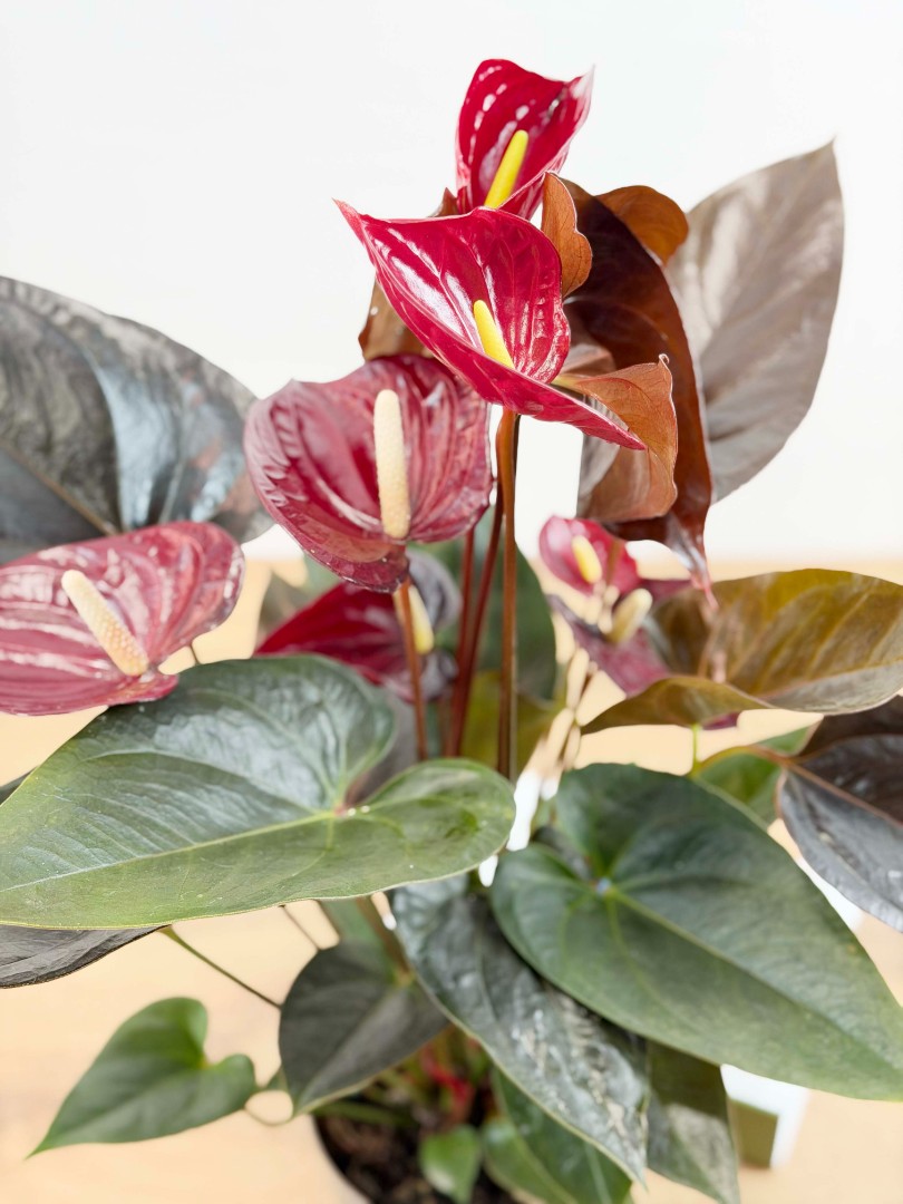 Если ярко-алый цвет классического антуриума кажется вам слишком кричащим, познакомьтесь с сортом «Деликата». Это аристократ в мире антуриумов. Его цветы окрашены в глубокий, насыщенный темно-бордовый, почти фиолетовый цвет, напоминающий дорогое выдержанное вино. Это растение не просто украшает дом, оно придает интерьеру статус и утонченность.