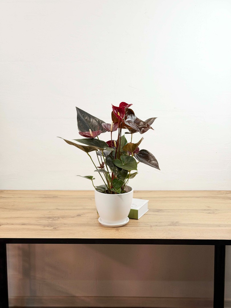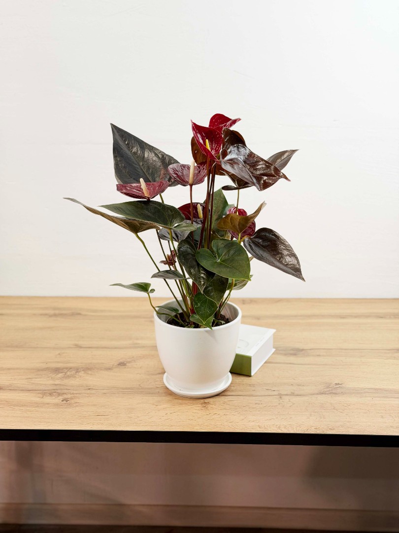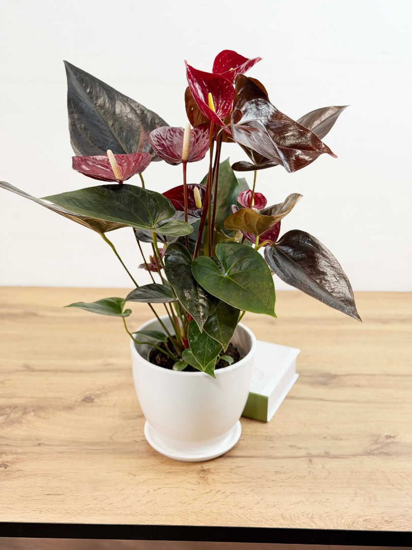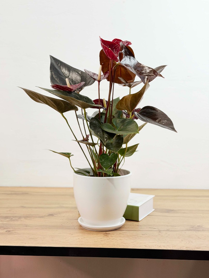 Антуриум «Деликата» в Белом горшке — благородный винный оттенок вашего счастья