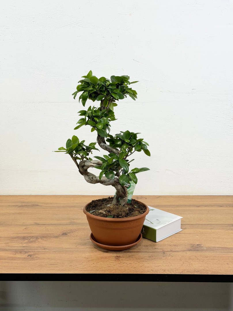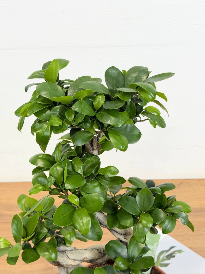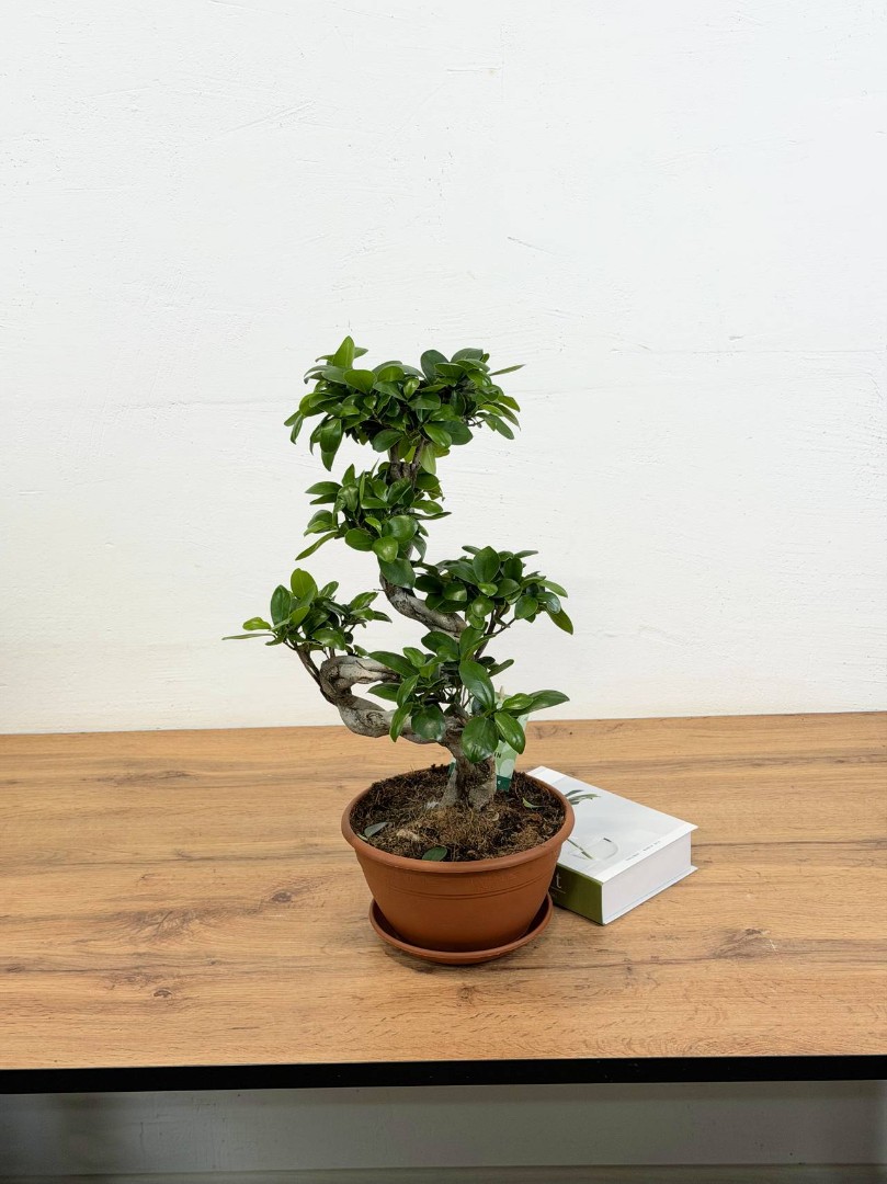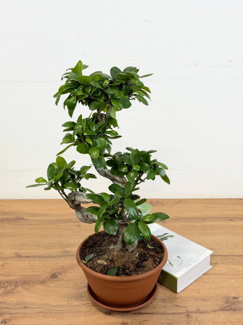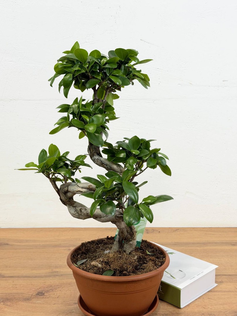 Фикус Микрокарпа гинсенг S-форма (Бонсай) D:22CM H:55CM – это удивительное растение, которое привлекает внимание своей необычной формой и красотой. Это миниатюрное деревце с толстым стволом и густой кроной из зеленых листьев станет прекрасным украшением вашего дома, офиса или другого помещения.