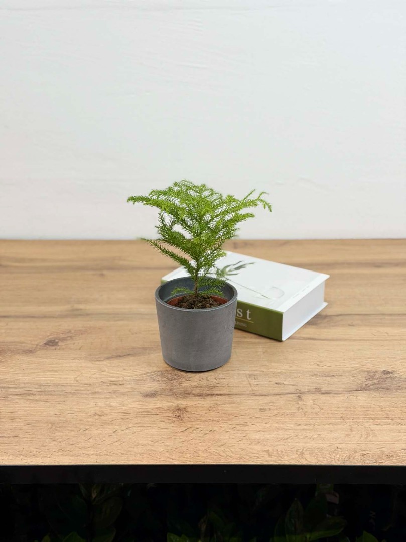 Араукария Хетерофилла в бетонном кашпо D:10см – это величественное хвойное растение, которое станет настоящим украшением вашего дома или офиса. Это медленно растущая комнатная ель, вечнозеленое деревце, которое может достичь высоты до 3-х метров, с густой кроной и маленькими мягкими иголками. Иголки имеют темно-зеленую окраску и расположены на ветвях спирально, ветви расположены почти горизонтльно. Для формирования равномерной кроны растение желательно поворачивать на 90 градусов 1 раз в неделю или обеспечить яркое освещение с двух сторон