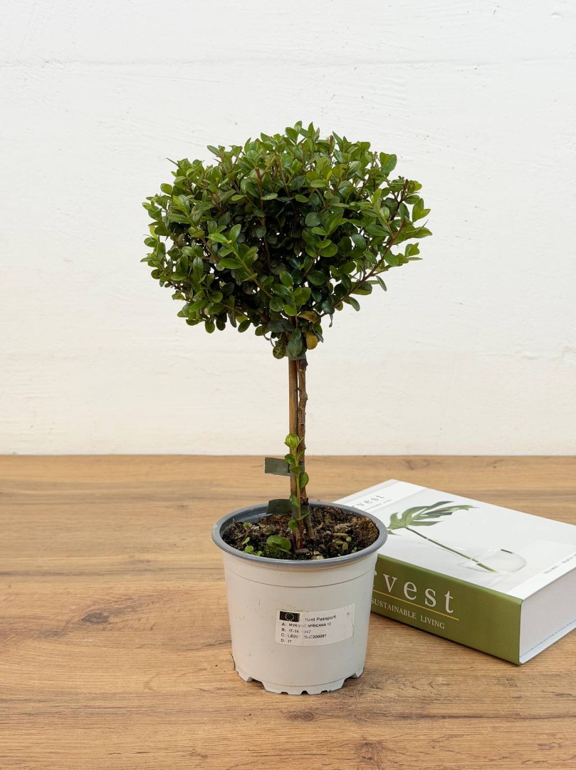 Мирсина, также известная как "африканский самшит", родом из горных регионов Африки и Южной Азии. В природе это вечнозеленый кустарник, который веками ценился за свою плотную листву и способность легко переносить стрижку. Наша Мирсина выращена в форме штамбового деревца, что подчеркивает ее природную красоту и превращает ее в настоящую живую скульптуру.