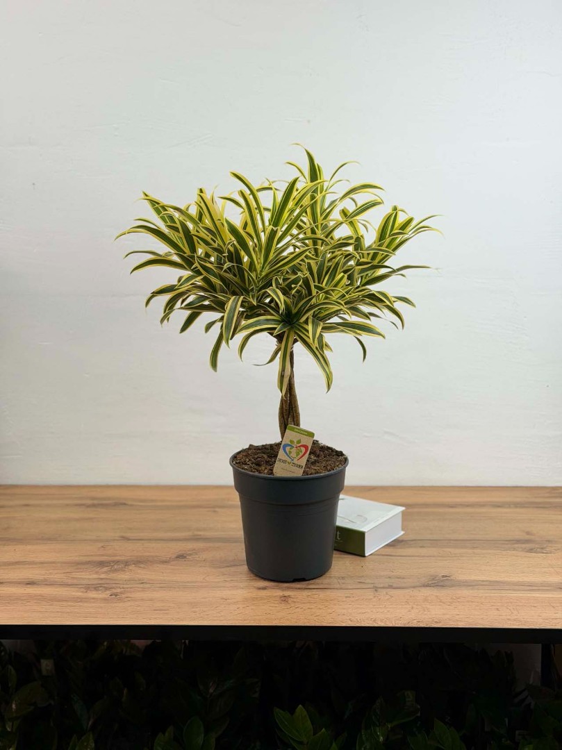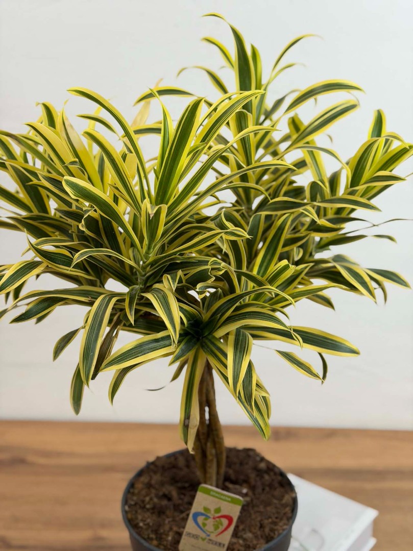 Это не та привычная драцена-"пальма", которую вы видели в офисах. Драцена «Песня Индии» (Song of India) — это растение-аристократ с уникальным характером. Ее стебли причудливо изгибаются, создавая неповторимый танцующий силуэт, а каждый лист обрамлен широкой, сияющей золотисто-желтой каймой. Это настоящее интерьерное украшение, которое выглядит дорого и экзотично.
