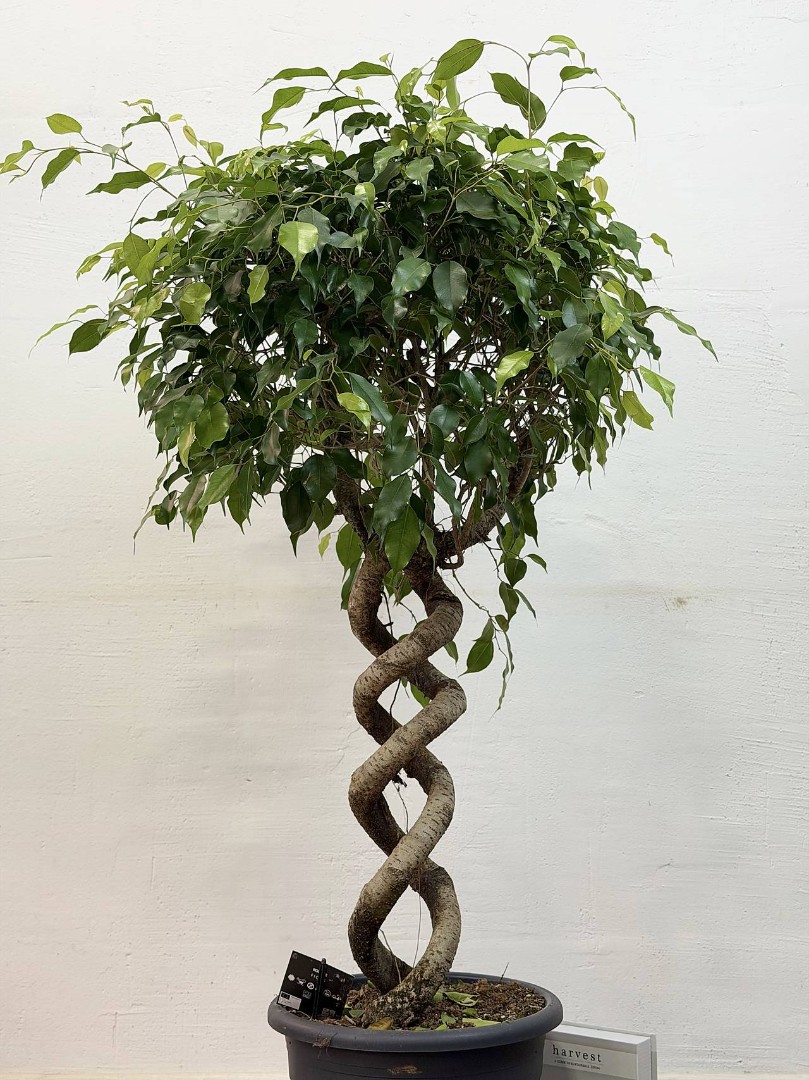 Фикус Бенджамина «Экзотика Двойная Спираль» D:32СМ H:140СМ - имеет зелёные листья с глянцевой поверхностью, которые образуют форму красивой шапки. Растение может достигать высоты более 3-х метров. Имеет густую крону, что делает его идеальным для создания уютной атмосферы в помещении. Это удивительное растение с изящным причудливым двойным спиралевидным стволом, которое станет прекрасным украшением вашего дома.