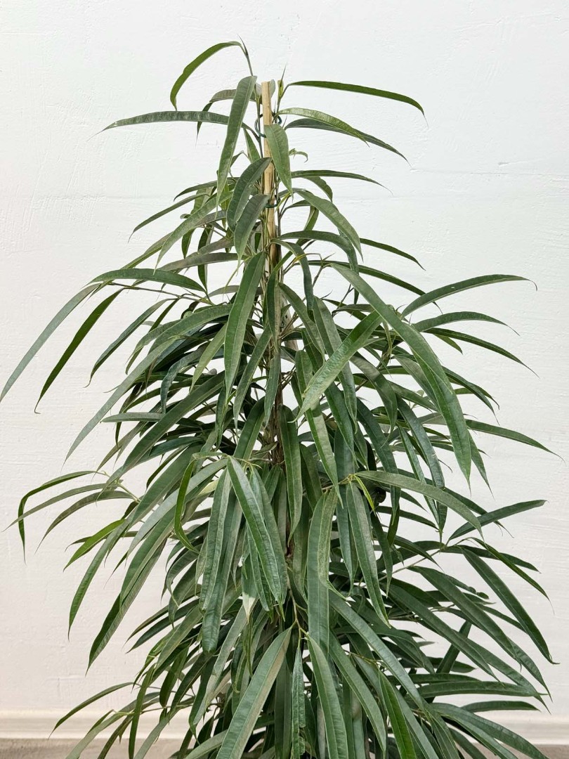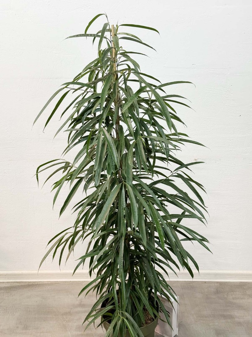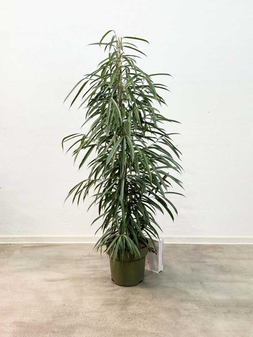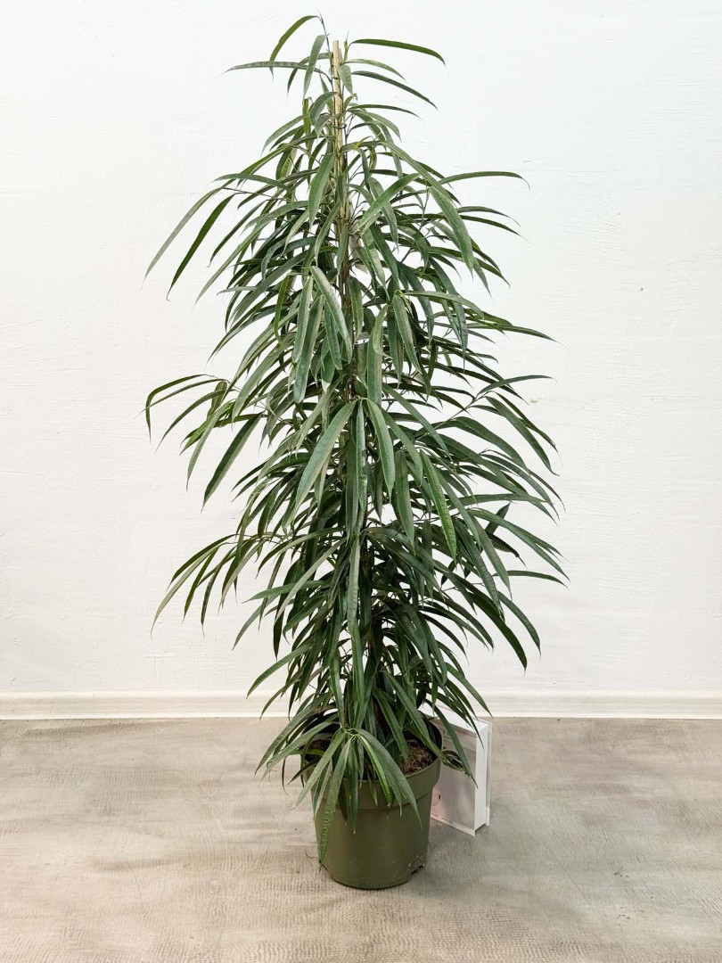 Фикус Биннедика Али D:27СМ H:150СМ - это экзотическое многолетнее растение, которое своим видом больше напоминает пальму. У него длинные тонкие листья насыщенно-зелёного цвета, которые сужаются к концу. Ствол покрыт корой коричневого окраса.