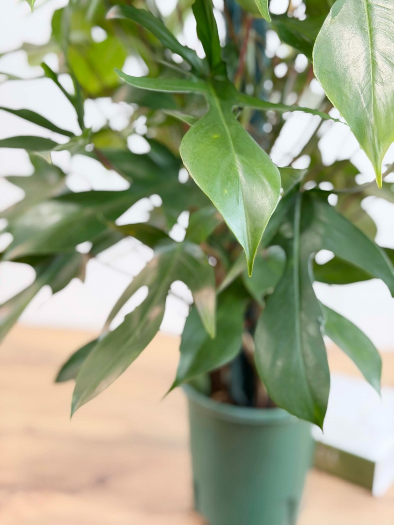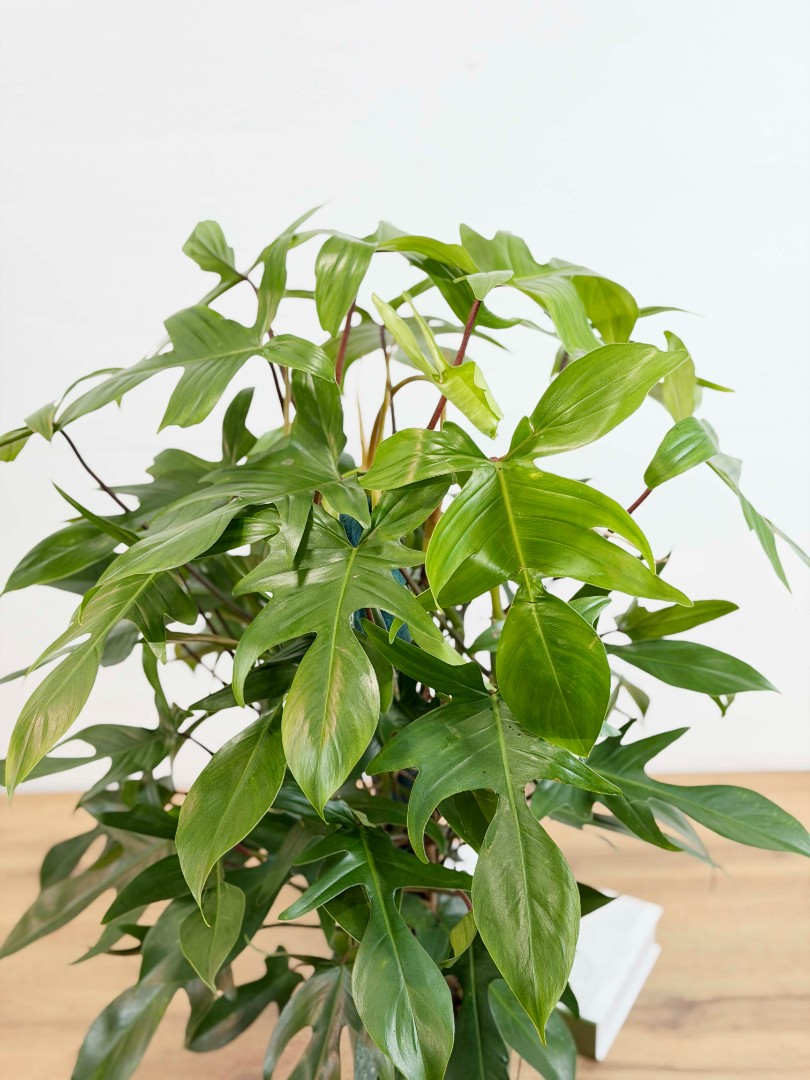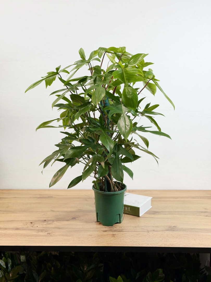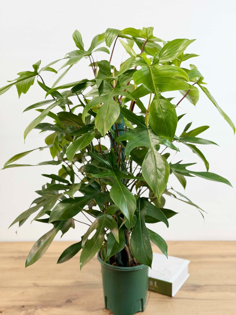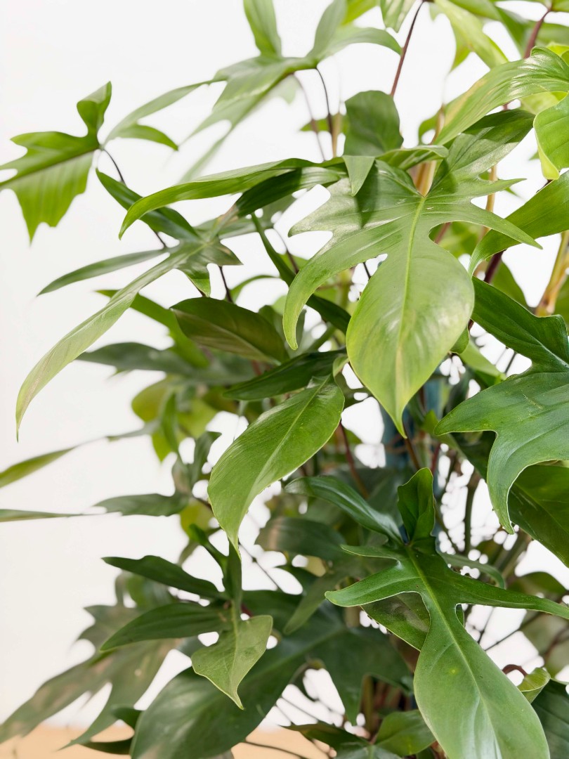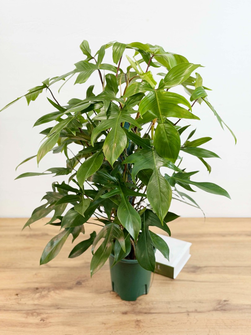 Филодендрон «Флорида Грин» — это растение для тех, кто ищет необычные формы. Его глубоко рассеченные, пятилопастные листья напоминают силуэт летящей птицы, самолета или даже дубового листа. Это мощная, эффектная лиана, которая мгновенно превращает комнату в тропический лес.