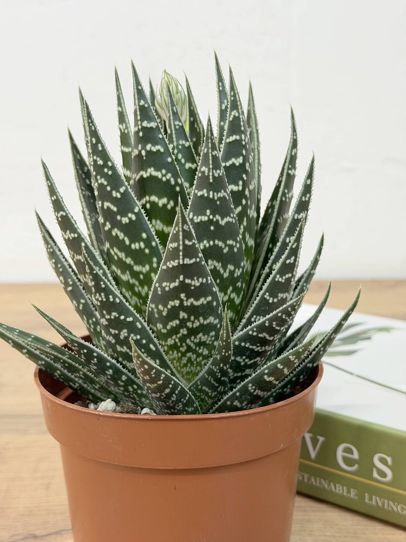 Забудьте о длинных, колючих стеблях привычного алоэ. Гибридный сорт «Тики Таки» создан исключительно для эстетического удовольствия. Это растение — настоящий мастер графики: его жесткие, треугольные листья глубокого темно-зеленого цвета густо усыпаны контрастными бело-салатовыми штрихами и крапинками. Оно выглядит так, словно его расписали тонкой кистью.