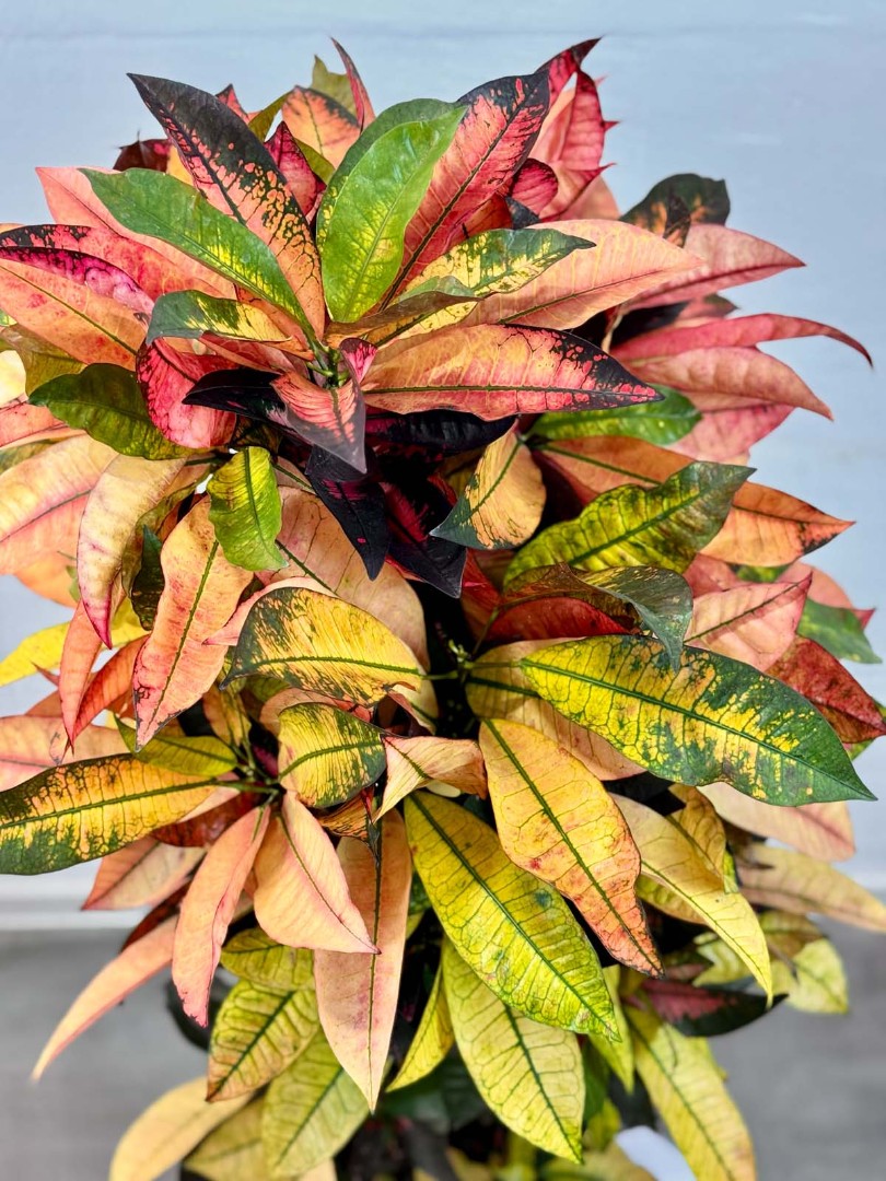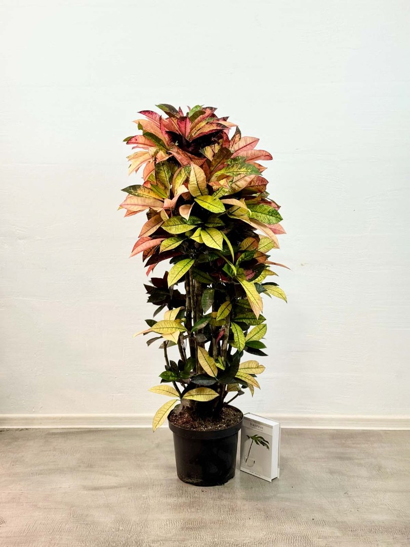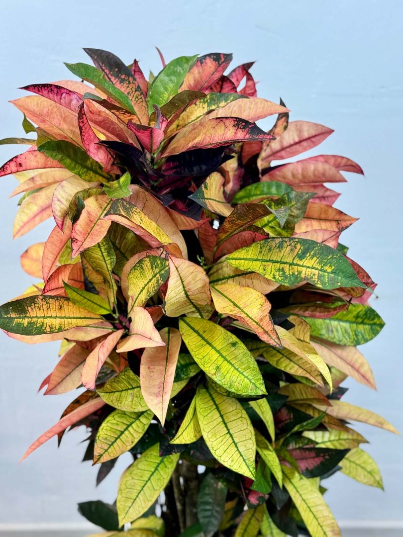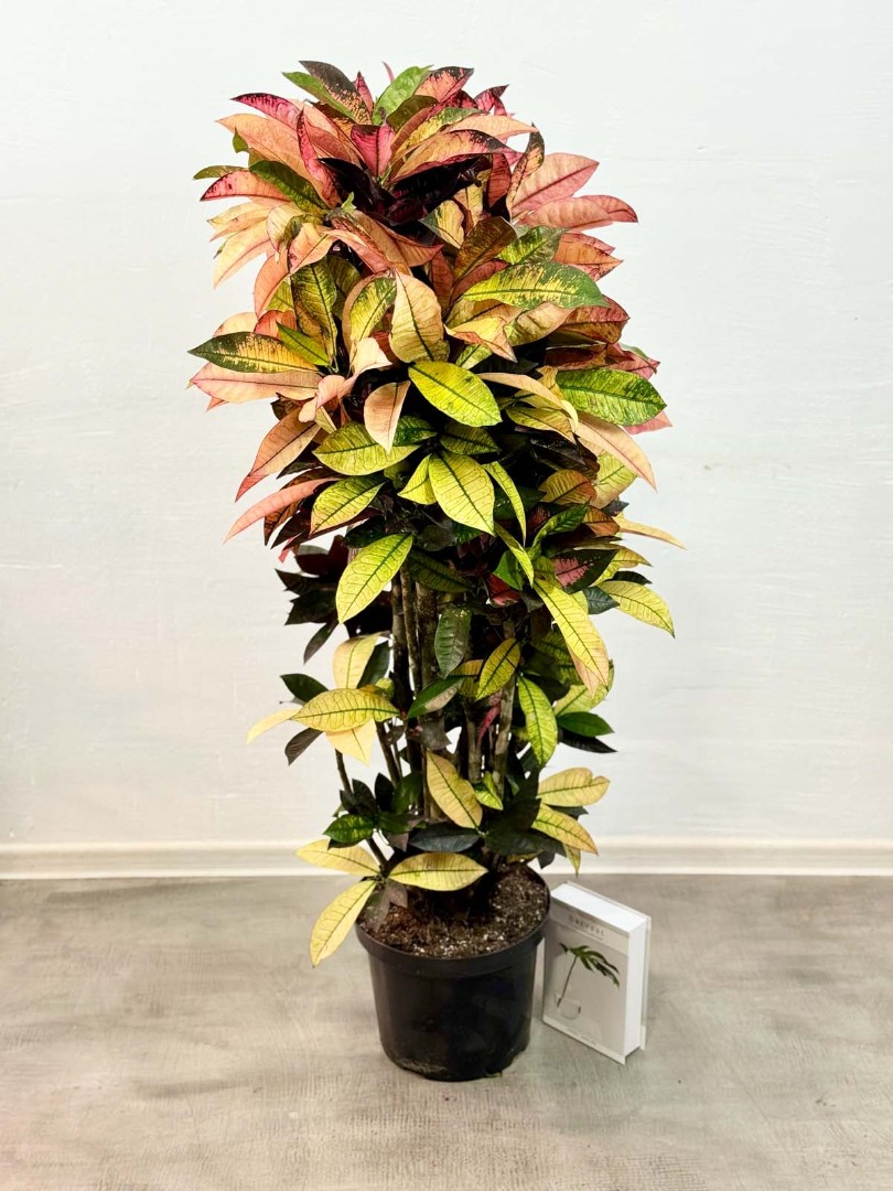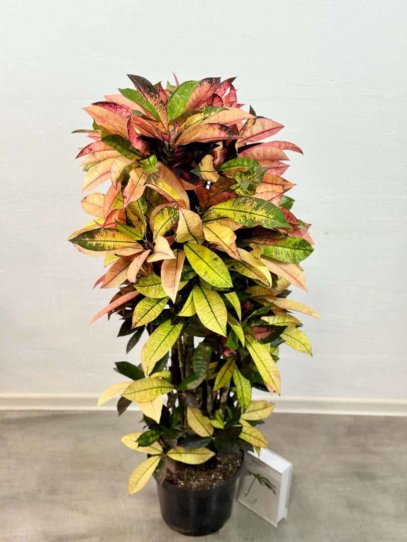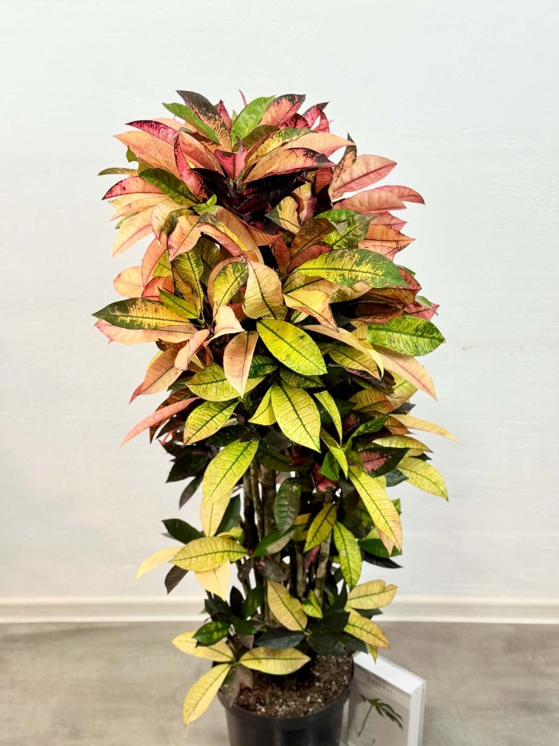 Кодиеум Миссис Айстон (Кротон разветвленный) D:30см H:140см – это удивительное растение, которое станет ярким акцентом в вашем интерьере. Его листья имеют разнообразную окраску, сочетая в себе оттенки зеленого, желтого, оранжевого и красного, создавая неповторимые узоры и рисунки.