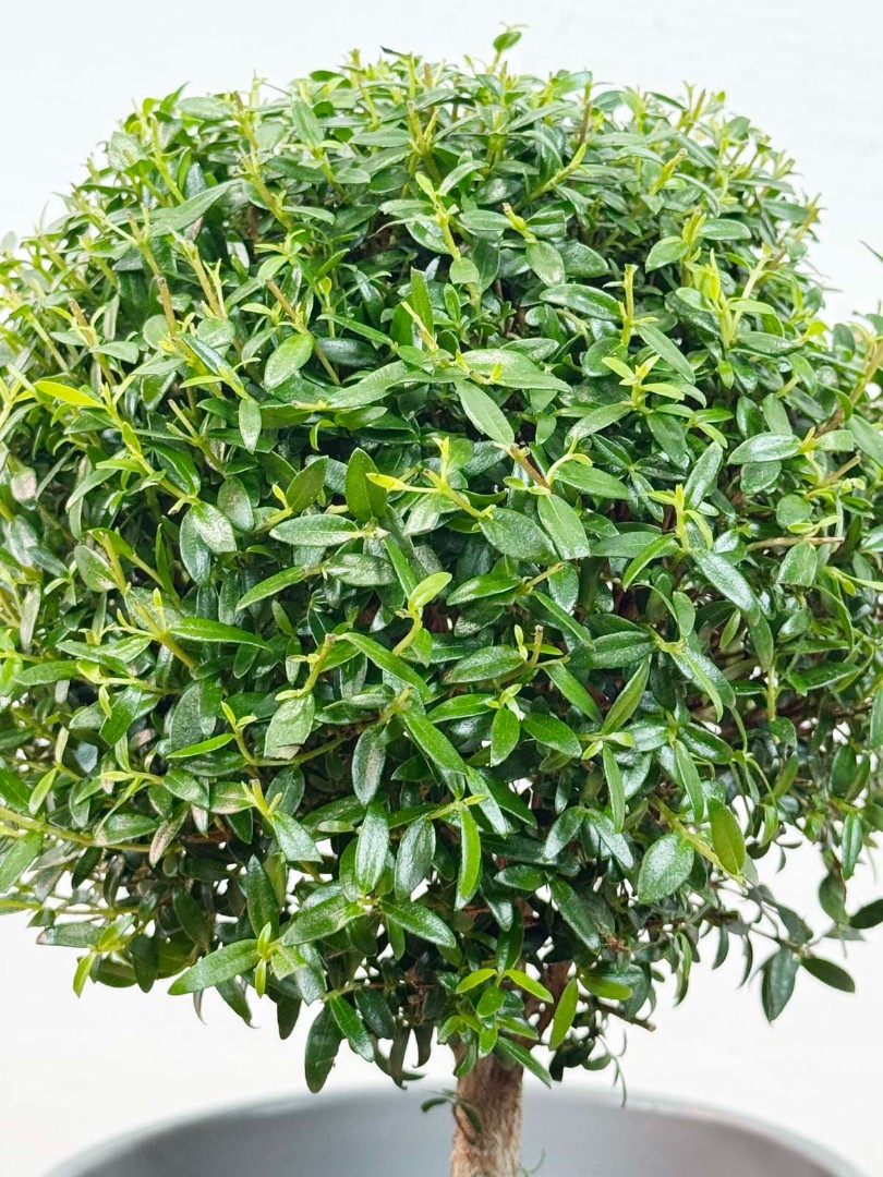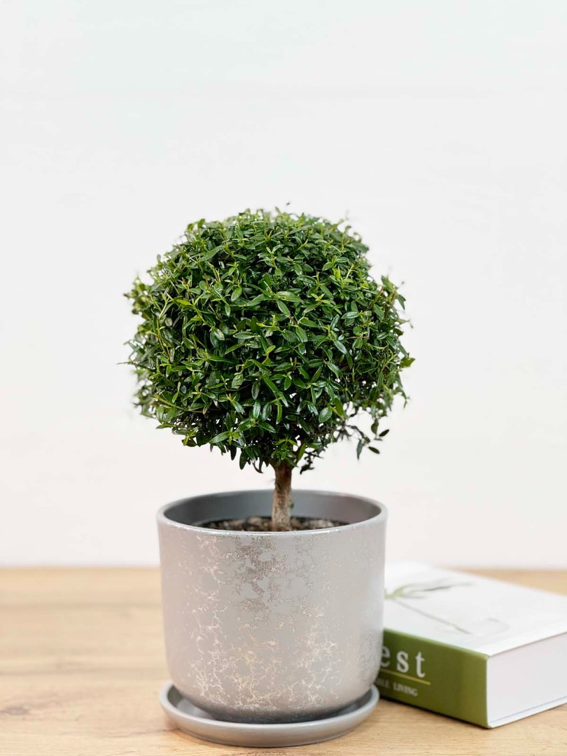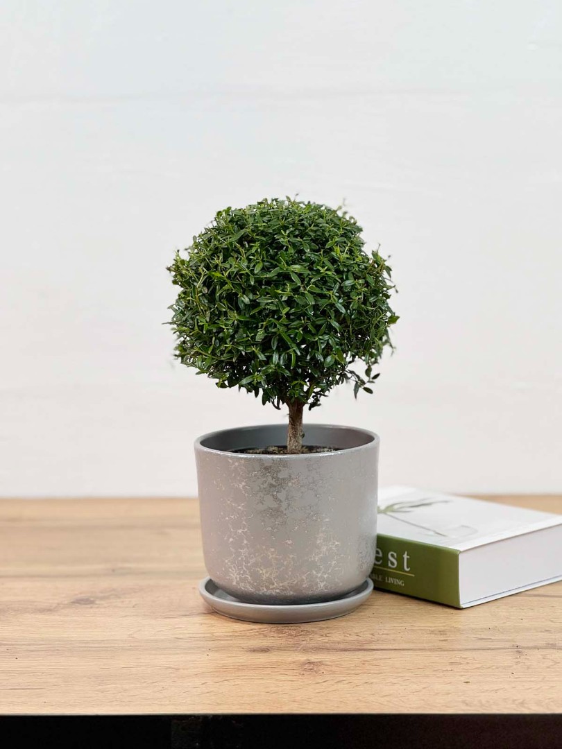 Мирт штамбовый в Сером горшке D:12см H:30см – это изысканное растение, которое станет настоящим украшением вашего дома или офиса. Оно представляет собой небольшое деревце с пышной кроной, покрытой мелкими блестящими листьями. Особенностью этого мирта является его форма, которая достигается путем специальной обрезки и формирования ствола.Вырастает до 70 см. Имеет густую и пышную крону и зкрасивых мелких, блестящих, темно-зеленых листочков.