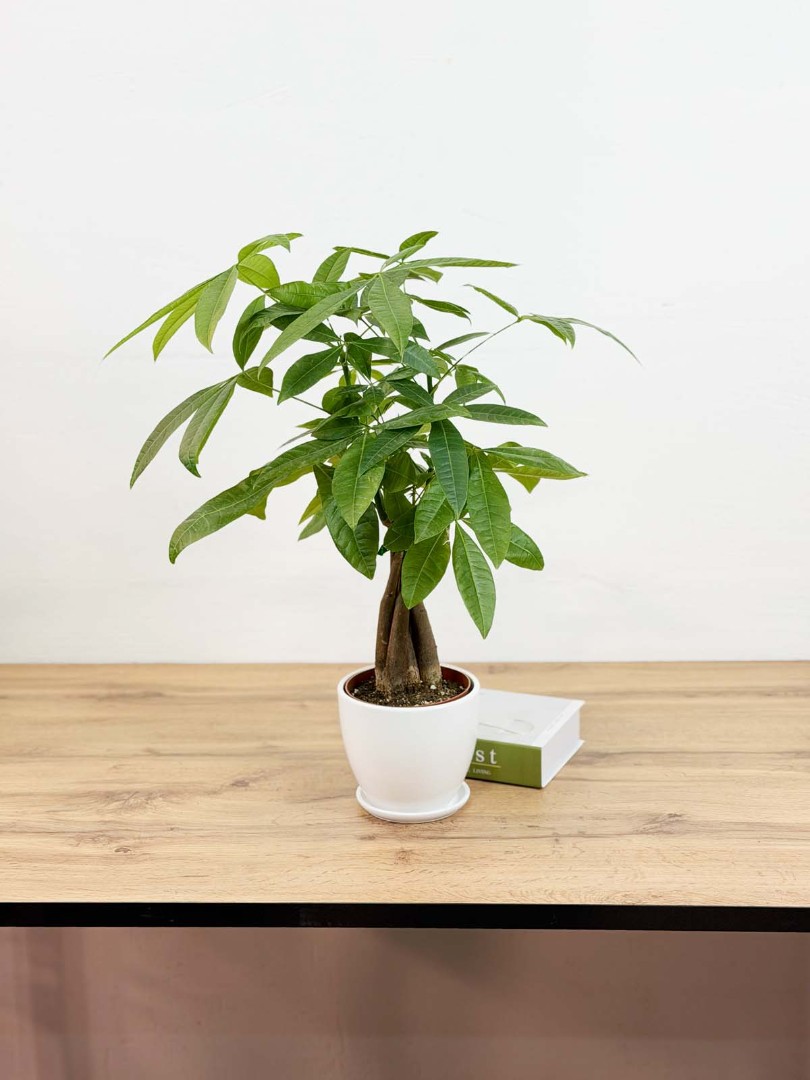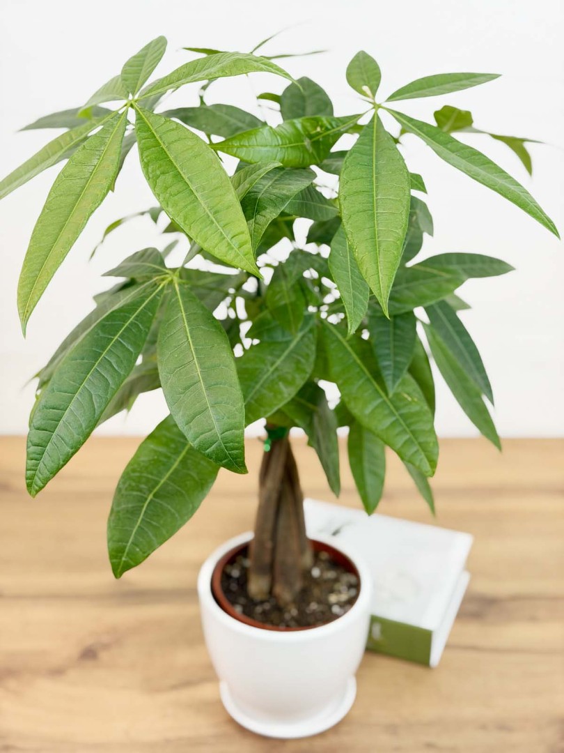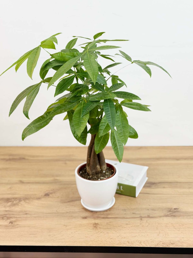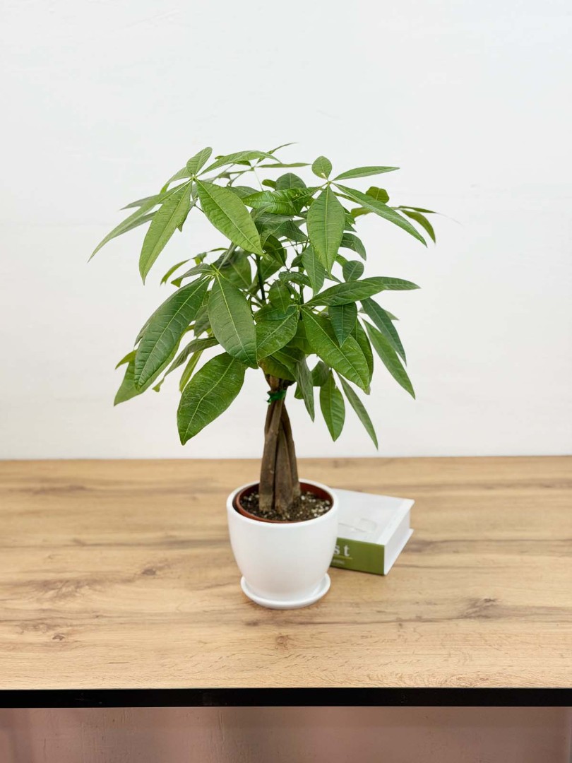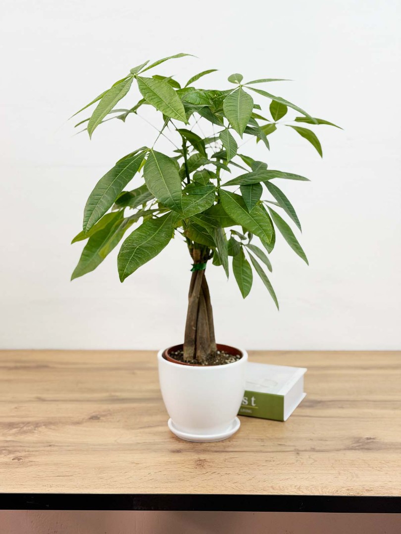 Пахира Акватика D:12см H:45см, также известная как «китайский каштан», представляет собой изящное комнатное растение с пышной кроной и эффектными листьями. Она меет стройный ствол, который со временем утолщается и становится похожим на бутылку. Листья растения крупные, ярко-зелёные, с глянцевой поверхностью. Они расположены на длинных черешках и создают пышную крону. В домашних условиях и при хорошем уходе может достигать высоты до 2 метров. Является популярным комнатным растением благодаря своей красоте и неприхотливости. Однако, чтобы она радовала вас своим внешним видом и здоровьем, необходимо обеспечить ей правильный уход.