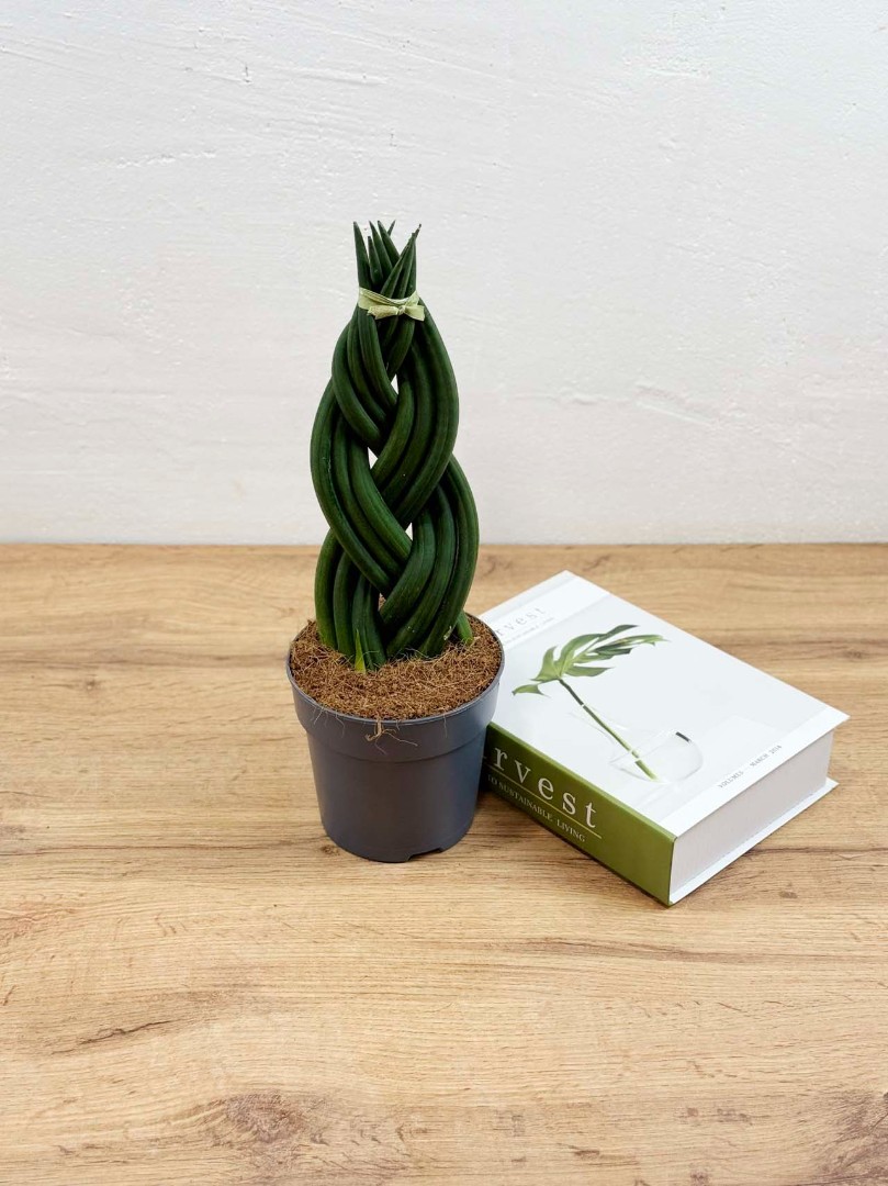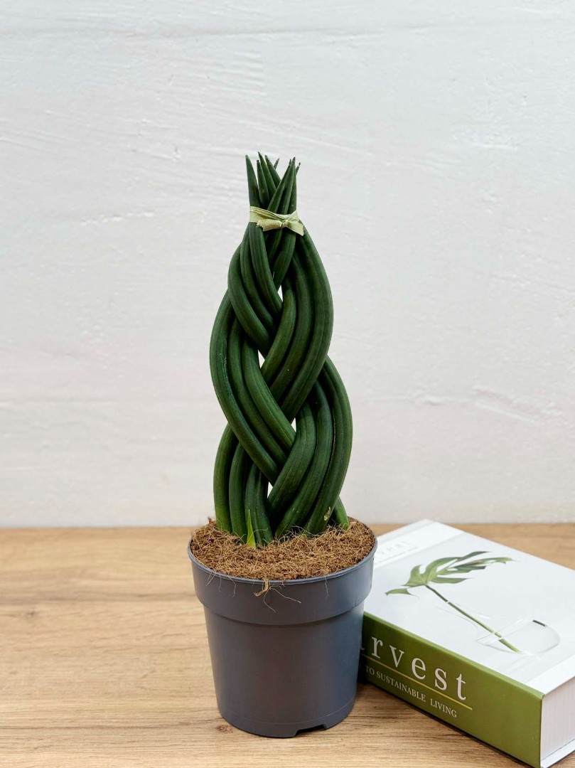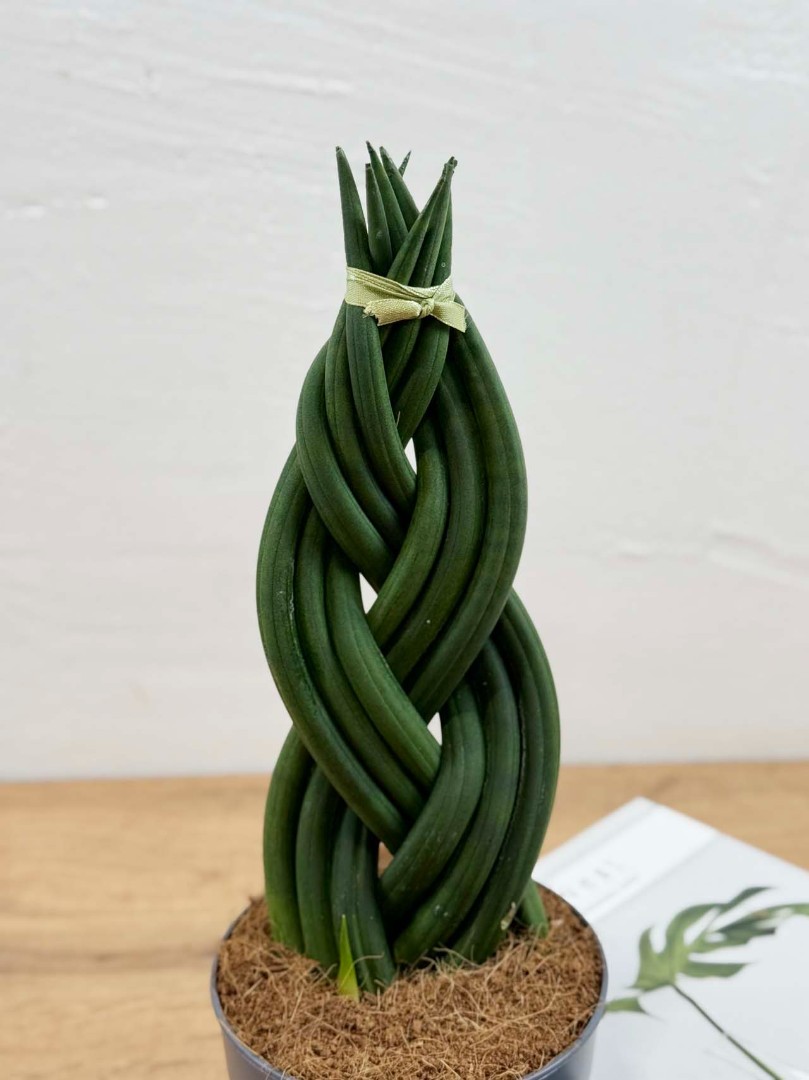 Сансевиерия переплетенная, известная также как «змеиная кожа», представляет собой необычное и неприхотливое растение, которое станет настоящим украшением вашего интерьера. Она имеет длинные, узкие листья, которые переплетаются между собой, создавая эффектный узор. Листья окрашены в тёмно-зелёный цвет с серебристыми полосами, которые придают растению уникальный вид. Растение может достигать высоты до 150 см и диаметра до 60 см.