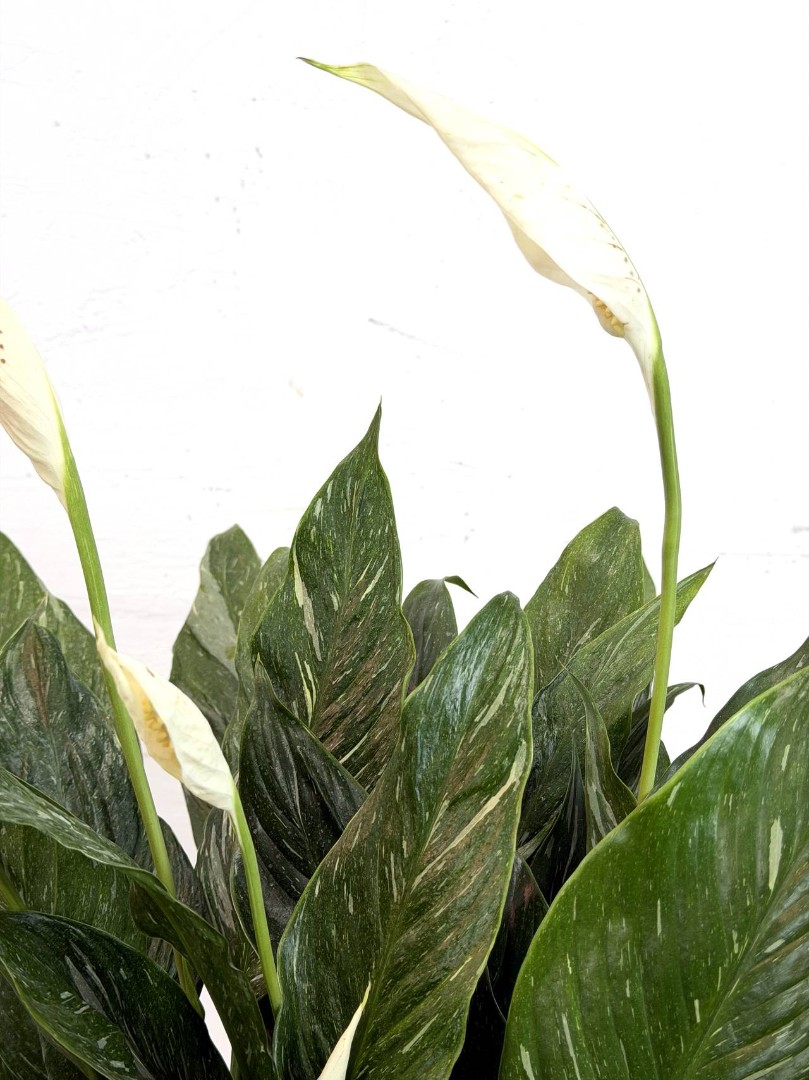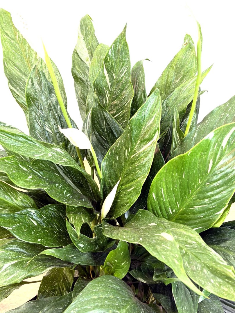 Все знают и любят классический Спатифиллум с его темной зеленью и белыми цветами. Но вариегатный (пестролистный) Спатифиллум — это совершенно другой уровень стиля. Это коллекционная редкость, в которой каждый лист уникален. Поверхность листьев щедро расписана природой: белые, кремовые и светло-зеленые штрихи, пятна и мазки создают невероятный мраморный узор. Это растение — настоящий арт-объект.